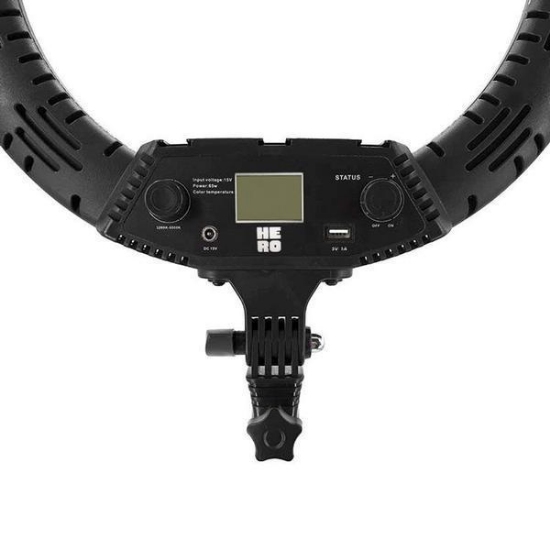 رینگ لایت عکاسی مدل HERO 416 یکی از مزایای آن، مجهز بودن آن به ریموت است که به این واسطه به راحتی می توان از فاصله دور، روشن و خاموش بودن دستگاه و همچنین شدت نور آن را کنترل کرد. رینگ لایت عکاسی مدل HERO 416 مجهز به صفحه نمایشگر (LCD) بوده و به واسطه آن می توان قدرت نور و دمای رنگ مورد نظر را انتخاب کرده و همچنین تنظیمات خود را بر روی آن مشاهده کرد. رینگ لایت مدل HERO 416 برخلاف تعدادی از Ring Light (رینگ لایت) های موجود در بازار دارای کیف مخصوص نیز بوده و به این واسطه حمل آن راحت وتر و ایمن تر نیز است و همینطور تغییر کلوین رینگ لایت عکاسی مدل HERO 416 از 3200 تا 5600 می باشد که تقریبا همان کلوین نور خورشید است، که همانطور که پیش تر هم گفته شد این متغیر کلوین باعث می شود تا شفاف ترین و دقیق ترین نور را هنگام فیلم برداری و عکاسی در اختیار عکاس و فیلم بردار قرار بدهد.