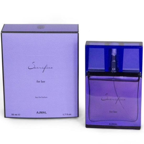 این عطر ۵۰ میلیلیتری «Sacrifice for Her» نام دارد. این عطر گلی در سال ۲۰۰۷ ساخته شده است. بطری Sacrifice for Her بسیار ساده و در عین حال شیک طراحی شده است. این شیشهی بنفش، بسیار تخت و خوشدست به نظر میرسد. روی شیشه، نام Sacrifice و در پایین آن نشان تجاری اجمل با رنگ تیره به چشم میخورد. در بطری با رنگ بنفش و شکل مکعبی و تختش بهخوبی روی شیشه سوار شده است.