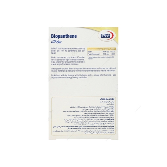 بیوپانتن یوروویتال با تحت لیسانس شرکت Euro OTC Pharma GmbH آلمان و در کارخانجات دارویی معتبر تولید می‌شود. این موضوع تضمین‌کننده خلوص، دوز دقیق و کیفیت بالای مواد اولیه است. شرکت حکیمان طب به عنوان نماینده انحصاری، اصالت این محصول را garantie می‌کند. هر جعبه حاوی 60 قرص است که برای مصرف دو ماهه (روزی یک قرص) طراحی شده و استفاده از آن را بسیار ساده و مقرون به‌صرفه کرده است. اگر به دنبال یک راه‌حل علمی، مؤثر و داخلی برای تقویت زیرساخت‌های زیبایی خود هستید، بیوپانتن یوروویتال با فرمول طلایی خود، انتخاب بی‌بدیلی است.
