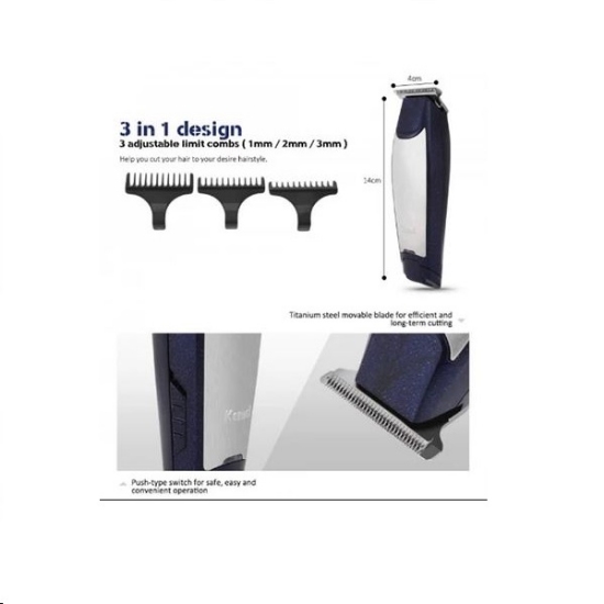 ماشین اصلاح مدل km-5021 ساخت شرکت کیمی، تیغه های این ماشین اصلاح از استیل ضد زنگ ساخته شده است که در مقابل هوا و رطوبت از مقاومت خیلی بالایی برخودار است. تکنولوژی برش این ماشین اصلاح بصورت مستقیم می باشد و به راحتی موها را با مرزبندی مشخصی کوتاه می کند. به همراه این ماشین اصلاح سه عدد شانه ارایه شده است و می توان از آن ها برای کوتاه کردن مو و سایه انداختن استفاده کرد. باتری ماشین اصلاح کیمی مدل km-5021 در مدت 8 ساعت بطور کامل شارژ می شود بعد از شارژ کامل دستگاه می توان از آن به مدت 60 دقیقه پیوسته استفاده کرد. همچنین به همراه این ماشین اصلاح روغن و برس ارایه شده است تا شما بتوانید پس از هر بار اصلاح تیغه را به خوبی تمیز و مرتب کرد