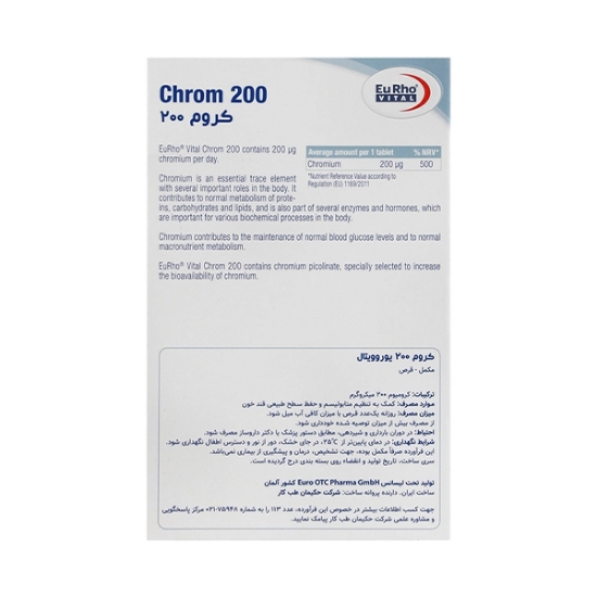 قرص کروم ۲۰۰ یوروویتال تحت لیسانس Euro OTC Pharma GmbH آلمان و با پروانه ساخت شرکت حکیمان طب کار تولید میشود. این محصول در جعبههای مقوایی حاوی ۶۰ قرص (۲ بلیستر ۳۰ تایی) عرضه میگردد.