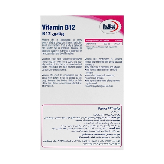 این مکمل با لیسانس کمپانی Euro OTC Pharma GmbH آلمان و با استانداردهای دقیق اروپایی، در ایران توسط کارخانه هگمتان داروی غرب بستهبندی شده است. این همکاری، تضمینکننده کیفیت، خلوص و efficacy محصول نهایی است. هر قرص حاوی ۵۰۰ میکروگرم ویتامین B12 است که به طور کامل نیاز روزانه یک فرد بزرگسال را برآورده میسازد و ذخیره کافی برای حفظ سطوح مطلوب این ویتامین در بدن ایجاد میکند.