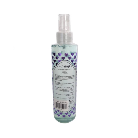 بادی اسپلش زنانه رینوزیت مدل اکلت دارای رایحه خنک و شیرین ، بسیار رقیق بوده و در ترکیبات آن از عطر طبیعی استفاده شده است و به عنوان یک ضد عرق و خوشبو کننده، جهت استفاده مستقیم بر روی پوست بدن بسیار موثر است. بادی اسپلش رینوزیت از لحاظ ساختاری کمی شبیه به اسپری‌های خوشبو کننده است، اما بر خلاف آن‌ها، در ترکیباتش از گاز استفاده نشده است. همچنین این اسپری ضد تعریق و خوشبو کننده با بوی سبکی که دارد، به هیچ عنوان سبب آلرژی، حساسیت و سر درد نمی‌شود. علاوه بر آن قیمت بادی اسپلش بسیار مقرون به صرفه بوده و شما می‌توانید به راحتی محصول را با خود حمل کنید و در صورت نیاز استفاده کنید.