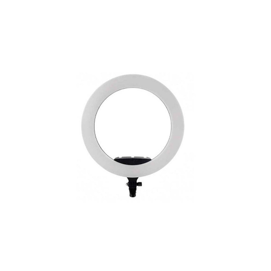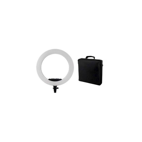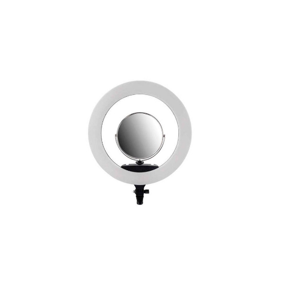 این رینگ لایت با 416 قطعه لامپ LED و با قدرت 96 وات یک نور ایده آل برای استفاده در محیط های آرایشگاهی و عکاسی پرتره و مدلینگ و ضبط فیلم برداری است.انرژی این رینگ لایت از برق شهری و به کمک آداپتور همراه آن تامین می شود.بر روی پنل پشتی رینگ لایت دو عدد پیچ برای تنظیم قدرت نور خروجی رینگ لایت و کلوین آن طراحی شده است.نور این رینگ لایت از 0 تا 100 درصد (بالاترین سطح روشنایی تا خاموش) قابل تنظیم است.همچنین دمای رنگ آن از 3200 تا 5500 کلوین متغیر می باشد.پورت USB موجود روی رینگ لایت به شارژ هم زمان موبایل حین استفاده از رینگ لایت کمک می کند.کاربر می تواند از طریق صفحه نمایشگر موجود روی بدنه ی پشتی رینگ لایت به تنظیمات خود دسترسی داشته باشد.همراه این رینگ لایت یک عدد هولدر موبایل و آینه دو طرفه ساده و مقعر برای عکاسی سلفی و خودآرایی ارائه می گردد.به کمک ریموت کنترل همراه رینگ لایت می توانید از فاصله ی دور تنظیمات نوری رینگ لایت را تغییر دهید و آن را روشن و خاموش نمایید همراه این رینگ لایت یک عدد کیف جهت حمل و نقل آسان ارائه می گردد. نور های حلقه ای یا رینگ لایت ها امروزه یکی از پرکاربردترین تجهیزات نورپردازی برای عکاسی پرتره ، مدلینگ و تبلیغاتی است. قطر بزرگ این رینگ لایت ها باعث ایجاد نور بسیار نرم و یکنواخت برای عکاسی و حتی گریم در اختیارتان قرار می دهد. میتوانید این رینگ لایت ها را بر روی سه پایه نور نصب کنید. علاوه بر این با استفاده از پایه هایی که به همراه این نور ارایه می شود می توانید گوشی هوشمند خود را بر روی این نورها نصب کنید. آینه های همراه این وسیله کمکتان می کند تا هنگام گریم یا عکاسی سلفی حداکثر دقت را در نظر داشته باشید.معمولا یک سمت این آینه معمولی (آینه تخت) و سمت دیگر با بزرگنمایی(آینه مقعر) است که برای آرایشگرها و شخصی که قصد دارد جلوی دوربین گریم کند مناسب است.شاید برای شما جالب باشد که آرایشگران حرفه ای با استفاده از این نور های ال ای دی و بدون نور های مزاحم می توانند گریم و آرایش های بدون نقصی داشته باشند. حتی در مسابقه ای که برای گریم و خود آرایی برگزار شده است همانطور که می بینید تمامی شرکت کنندگان از این رینگ لایت ها استفاده می کنند. این محصول شامل رینگ لایت/آینه/هولدر موبایل/ریموت/آداپتور/کیف است.