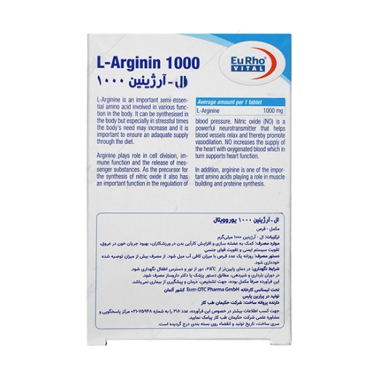 ال-آرژنین 1000 یوروویتال با تحت لیسانس شرکت Euro OTC Pharma GmbH آلمان و با رعایت استانداردهای دقیق تولید میشود. این امر ضمانت میکند که شما دقیقاً همان چیزی را دریافت میکنید که روی بستهبندی درج شده است: یک دوز مؤثر و خالص از ال-آرژنین. شرکت حکیمان طب کار به عنوان دارنده پروانه ساخت، اصالت این محصول را تضمین مینماید. هر جعبه حاوی 60 قرص است که برای مصرف یک تا دو ماهه (معمولاً روزی 1 تا 2 قرص) طراحی شده است. برای ورزشکاران، بدنسازان، افراد فعال و آنانی که به دنبال ارتقای سلامت گردش خون و عملکرد جنسی خود هستند، ال-آرژنین 1000 یوروویتال یک انتخاب اساسی و هوشمندانه است.