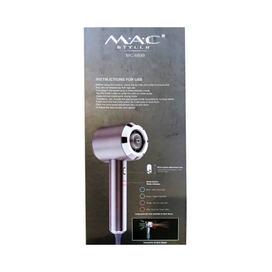شامل متمرکز کننده دهان باریک ۹ میلی متری آهنربایی است .موهای خود را در هر زمان که می خواهید بدون نگرانی و بدون سر و صدا خشک کنید ، زیرا سشوار مک استایلر دارای فناوری بی صدا است. برای افرادی که موهای بلند و پرحجم دارند ، به دلیل سبکی و حالت ایده آل ، مناسب است.