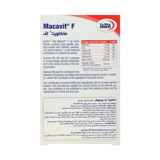 کپسول ماکاویت اف (Macavit F) از برند معتبر یوروویتال (Eurho Vital)، مکملی تخصصی برای بانوان است که با ترکیبی از عصارههای گیاهی، ویتامینها و مواد معدنی، به بهبود سلامت عمومی، تنظیم عملکرد هورمونی و افزایش انرژی روزانه کمک میکند. این مکمل با هدف پشتیبانی از سیستم تولیدمثل بانوان و ارتقای کیفیت زندگی آنان طراحی شده است.