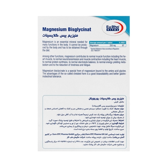 منیزیم بیس گلیسینات یوروویتال با تحت لیسانس شرکت Euro OTC Pharma GmbH آلمان و مطابق با استانداردهای سختگیرانه اروپایی تولید میشود. این امر ضمانتی بر خلوص، دوز دقیق و اثربخشی حداکثری محصول است. شرکت حکیمان طب کار، به عنوان دارنده پروانه ساخت و نماینده انحصاری، اصالت و دسترسی به این محصول باکیفیت را در ایران تضمین مینماید. هر جعبه حاوی 60 قرص در 4 بلیستر 15 تایی است که نیاز یک تا دو ماهه شما را بسته به دوز تجویز شده پوشش میدهد. اگر به دنبال یک فرمول مؤثر، با جذب بالا و بدون عوارض گوارشی برای رسیدن به آرامش عمیق، خوابی راحت و انرژی پایدار هستید، منیزیم بیس گلیسینات یوروویتال، انتخاب برتر و هوشمندانهای است که تفاوت محسوسی در کیفیت زندگی شما ایجاد خواهد کرد.