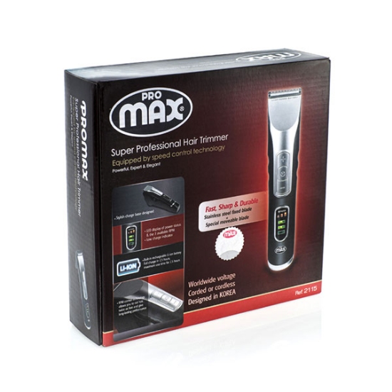 ماشین اصلاح پرومکس مدل ۲۱۱۵ دارای تیغهی استیل ضدزنگ ، طول اصلاح ۱ میلیمتر، ۲ شانهی اصلاح از ۳ -۴ -۵ -۶ میلیمتر و باتری قابل شارژ (۹۰ دقیقه شارژ و ۹۰ دقیقه استفاده) بوده و با برق و باتری میتوان از آن استفاده کرد.