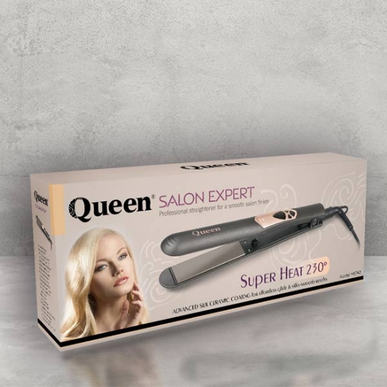 اتو مو کویین مدل HS740 دستگاهی است با صفحات روکش سرامیکی که برای صاف کردن موها به کار می رود. عرض صفحات اتو مو 30 میلیمتر بوده و برای موهای بلند و متوسط مناسب است. سرامیکی بودن این صفحات باعث میشود حرارت به شکل یکنواختی در همهی قسمتها پخش شود و به مو آسیبی وارد نشود. این محصول بهسرعت گرم میشود و مدتزمان لازم برای گرمایش و قابلاستفاده شدن به 30 ثانیه کاهش پیداکرده است.
