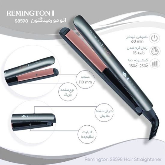 اتوی مو رمینگتون مدل S8598 انتخابی ایده آل برای افرادی که به کالا های لوکس علاقه دارند. محصولات کمپانی ریمینگتون علاوه بر داشتن جدید ترین تکنولوژیهای روز دنیا دارای خاصیت درمانی نیز است. از دست رفتن کراتین داخل مو اصلیترین دلیل بروز خشکی، شکنندگی و آسیب دیدگی آن است، به دلیل داشتن همین خصوصیت این اتو مو آسیب دیدگی و شکنندگی مو های شما را کاهش میدهد و محافظ کراتین مو های شما است.