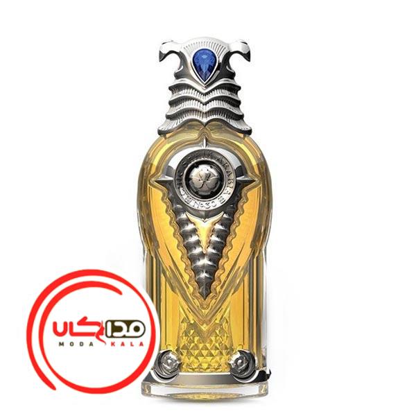 روی در بطری، یک نگین آبیرنگ کار شده که نمادی از مراقبت و محافظت است و به طراحی مرموز و جذاب این عطر میافزاید. مایع طلاییرنگ درون بطری از طریق شیشه شفاف قابل مشاهده است که حس لوکس بودن و کیفیت بالا را منتقل میکند.