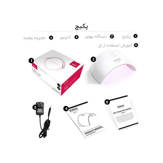 در پکیج این محصول یک دستگاه یووی سان به همراه یک عدد آدامپور مناسب این دستگاه و دفترچه راهنمای کار با دستگاه و جود دارد.