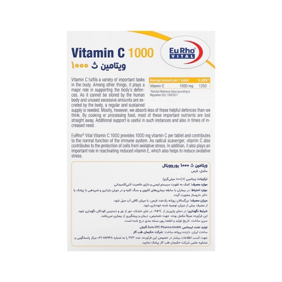 ویتامین C 1000 یوروویتال با تحت لیسانس شرکت Euro OTC Pharma GmbH آلمان و مطابق با استانداردهای دقیق اروپایی تولید می‌شود. این امر ضمانتی بر خلوص و قدرت دوز declared است. شرکت حکیمان طب کار به عنوان دارنده پروانه ساخت، اصالت این محصول را تضمین می‌نماید. هر جعبه حاوی 60 قرص است که برای مصرف دو ماهه (روزی یک قرص) طراحی شده است. اگر به دنبال یک پایه ثابت و غیرقابل انکار برای برنامه سلامت خود هستید، ویتامین C 1000 یوروویتال یک انتخاب ضروری و هوشمندانه است.